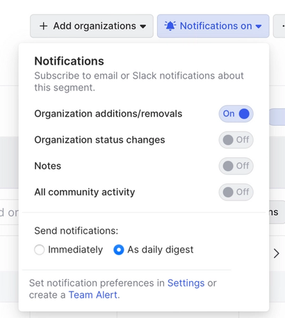 We’ll toggle on Organizations additions/removals and choose to receive it as a daily digest. We can always change where we receive notifications from the Settings menu.