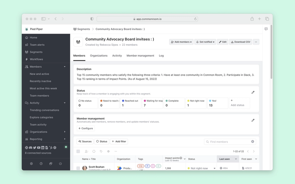 We’ll also want to add member statuses to this segment to track our outreach efforts. We can add statuses like Need to reach out, Reached out, Responded, etc.