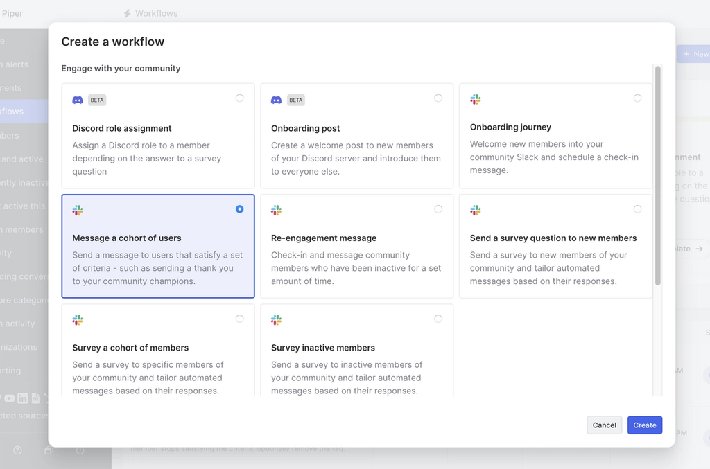 You could do this manually in Slack, but that’s pretty tedious to manage over time. Instead, we’ll create a workflow to send bulk messages. Head over to the Workflows view and start with the Message a cohort of users workflow.
