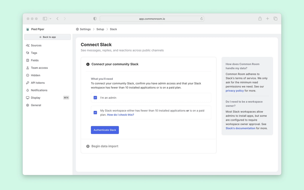 To start, we'll want to connect to the above sources using Common Room.