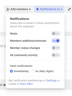 We want be notified when new activity occurs, so let's click Get notified in the upper-right menu and then toggle Members additions/removals to the On position.