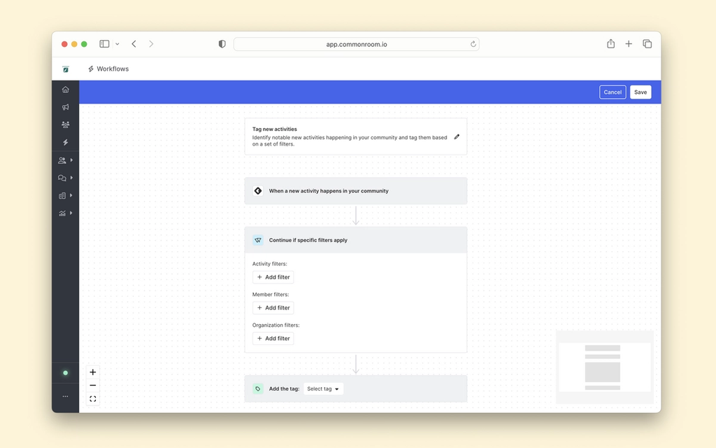 Next, we will set up a Tag new activities workflow that will tag all net-new activities that pop up in our community that contain the buyer intent keywords we've already identified in Step 3.