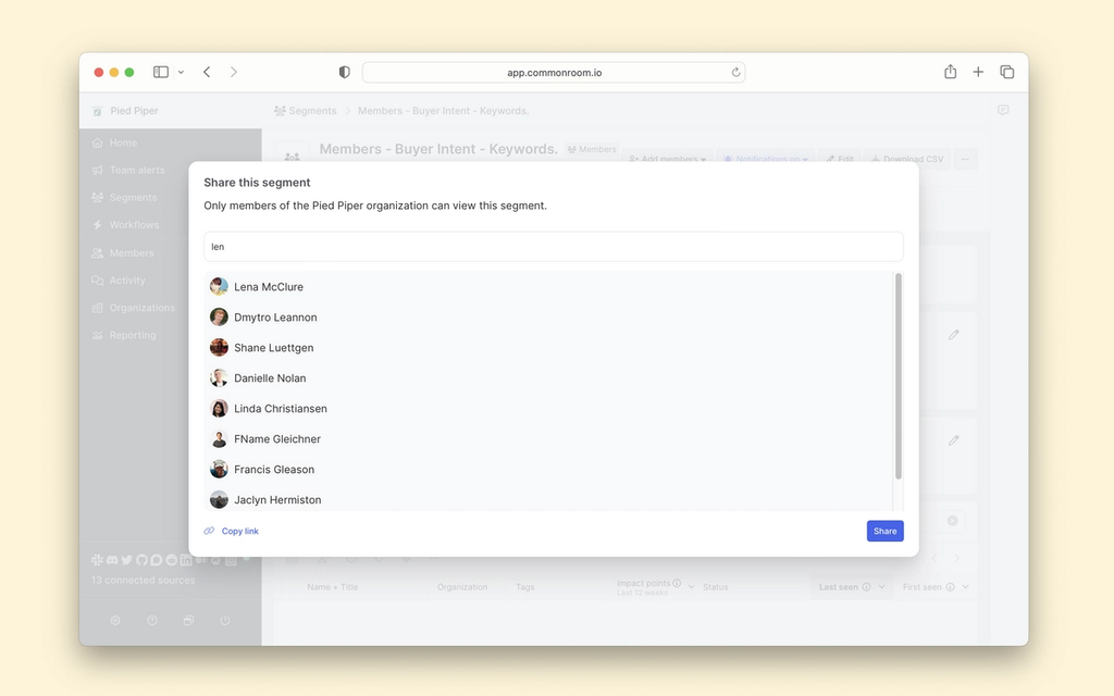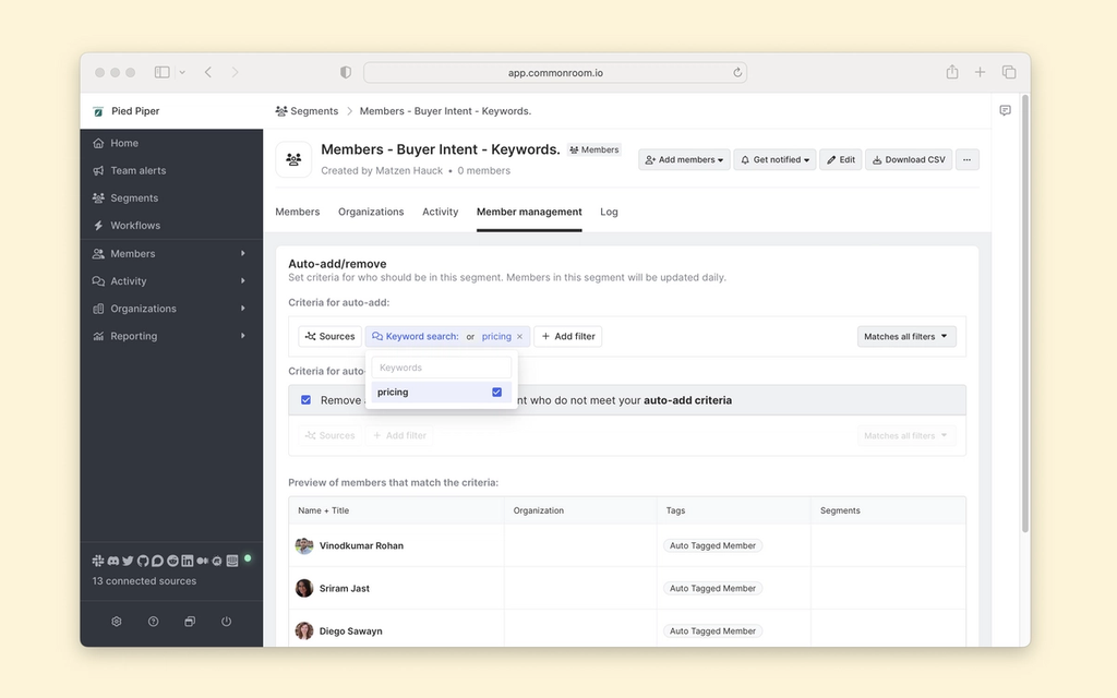 Segments in Common Room offer a powerful way to manage groups of members with similar attributes. In this case, we'll tightly control and trigger intent alerts for members with similar intent-keyword attributes.