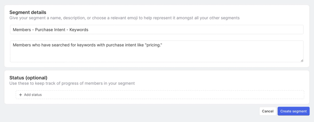 We can give our segment a name and description (you'll need to locate this again in the next step). We won't be using the status functionality for this specific segment, so we can now click Create segment at the bottom-right corner of the screen.