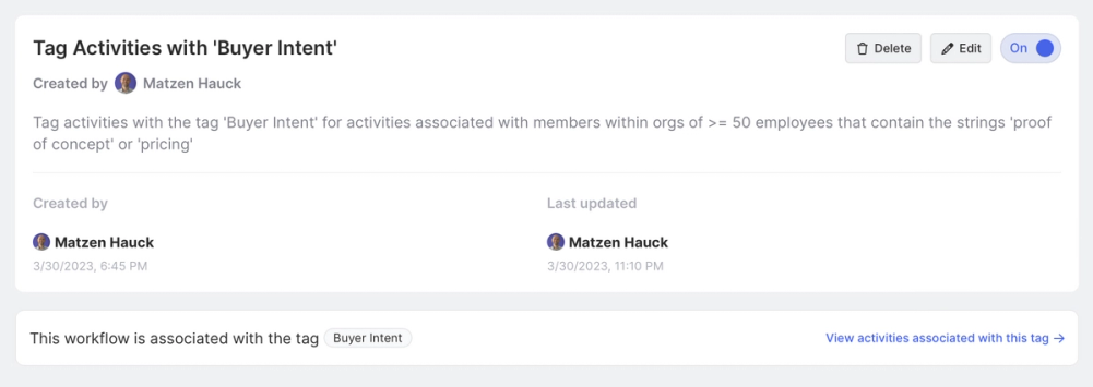 Hit Save in the upper right corner of the workflow module and toggle the workflow to On. We can now view our newly created workflow on the Workflows page and rest easy, knowing that our efforts will help Sales reps take action with context around purchase intent signals.