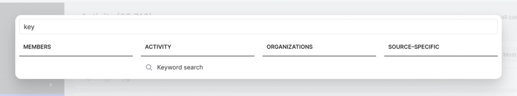 We'll click Keyword search, returning us to the main list of all activities in our community. We can now use keyword search like we would any other search operator to help us identify which high-intent keywords will produce both the volume and signal needed for us to feel confident triggering a sales alert.