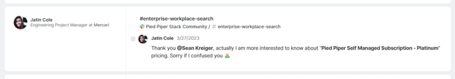 We also think "pricing" may be a strong keyword signal for us. So, we search for that term, and what we find is encouraging — volume jumps up significantly to about 2,500 activities and we see strong-signal activity like this gem from our community Slack: