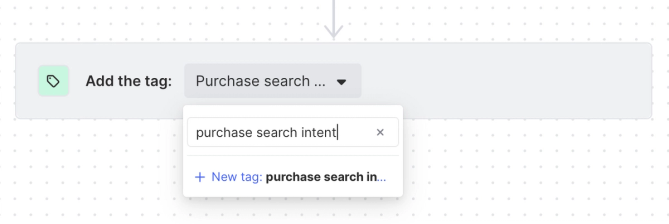 Add "proof of concept" and "pricing" to the filter. Now we're ready to add the tagging step to complete the workflow. Click Select tag to the right of the green tag icon and begin typing ”Purchase search intent” into the field. We haven't created the tag, so we'll select + New tag: and label it “Purchase search Intent.”