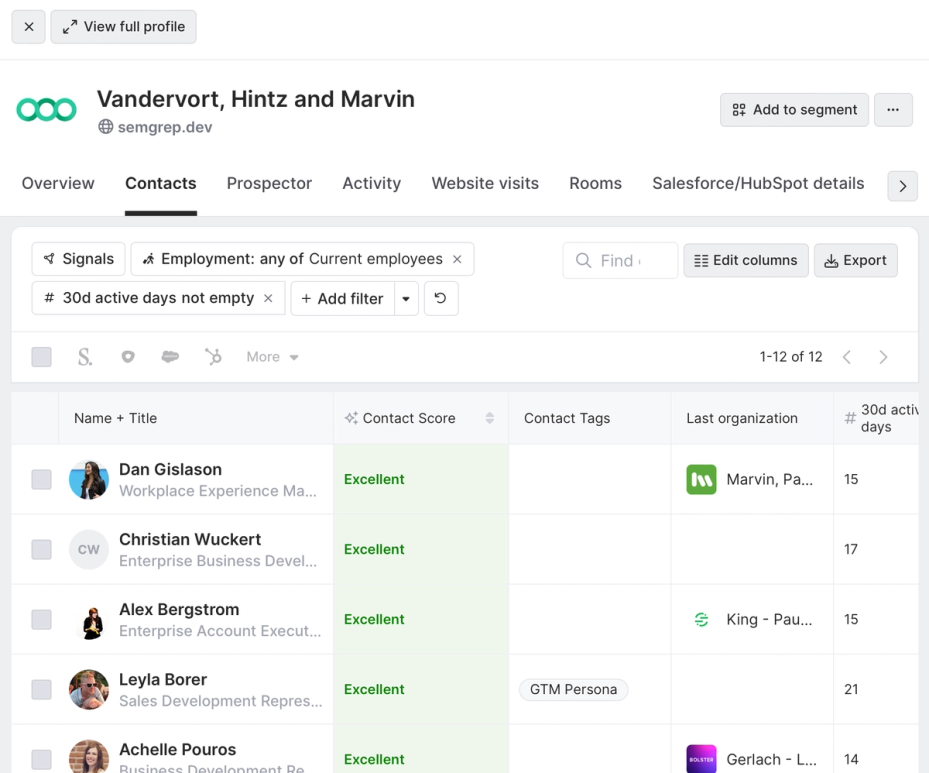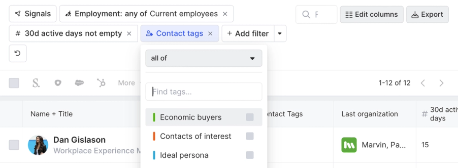 We can easily filter this list of contacts further to uncover people tagged as economic buyers, recent job-changers, and more.