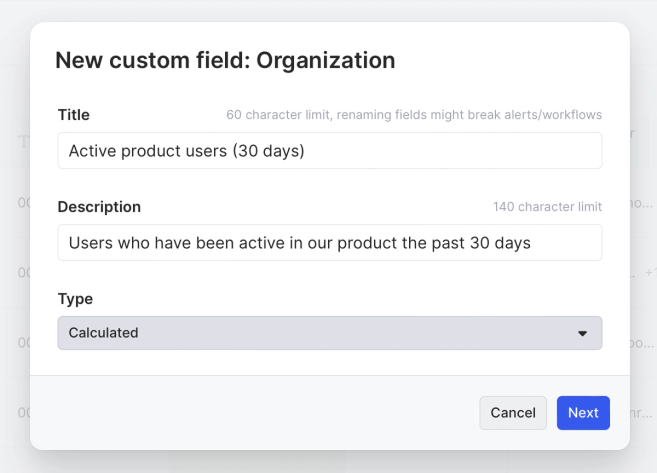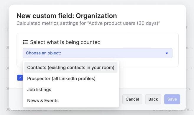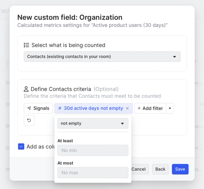 For this example, let’s say we want to see how many people within an account have been active in our product over the past 30 days. We’d configure the field to make sure we’re counting that record.