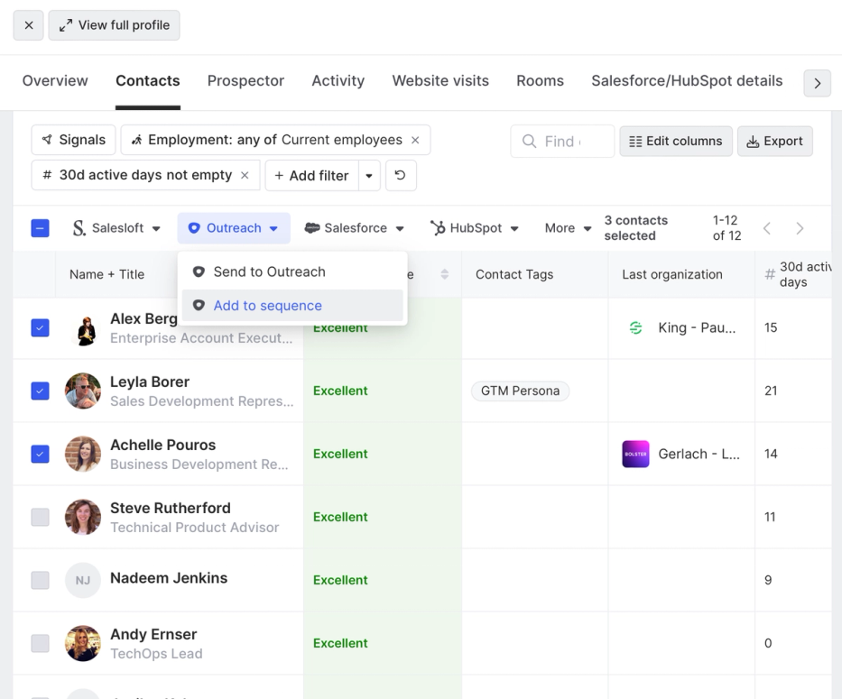 We can sync them with our CRM, push them to campaigns in our marketing automation tools, or add them to personalized outbound sequences in our sales execution platforms. No tab-hopping necessary.