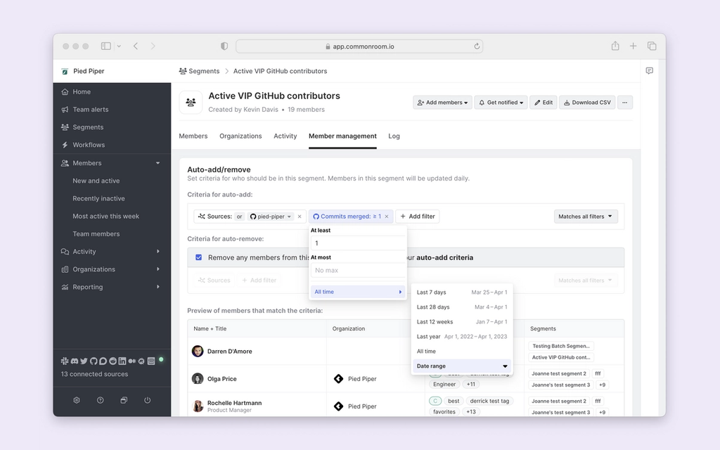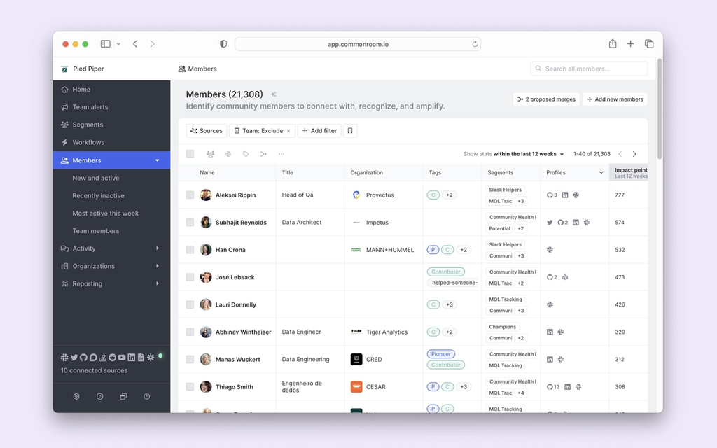 In this tutorial, we’ll create a cohort for top contributors and one for recent contributions by high-profile accounts. We can head over to the Members view in Common Room to do that.