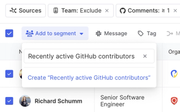 Adding a filter for > 1 commit in the last 28 days narrows our list to a few dozen. This is what we were looking for — our top recently active contributors. We can select all members from here and add them to a new segment.