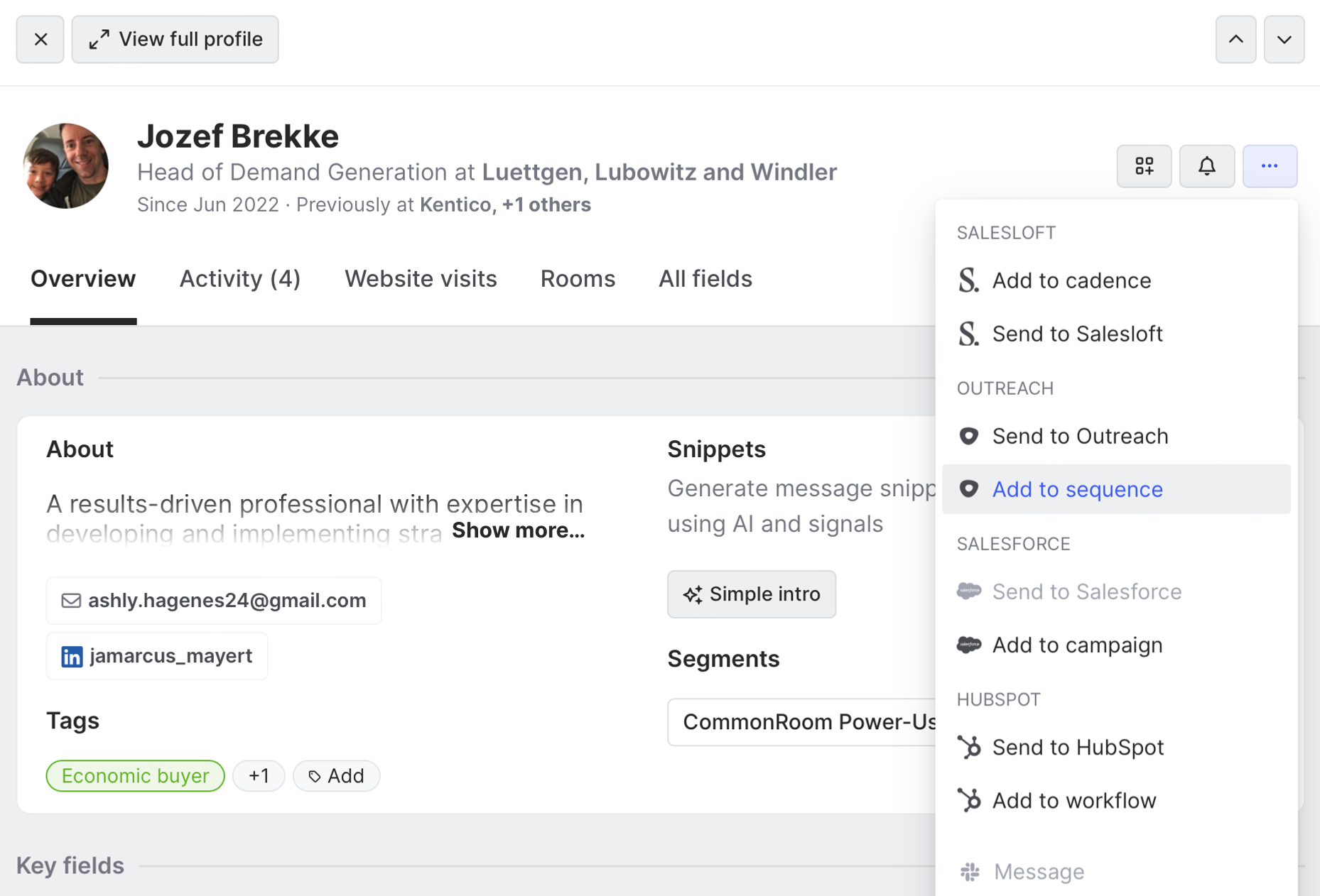 From here can easily sync them with our CRM, add them to segments for different sales plays, or drop them into a personalized outbound sequence—all from the same place.