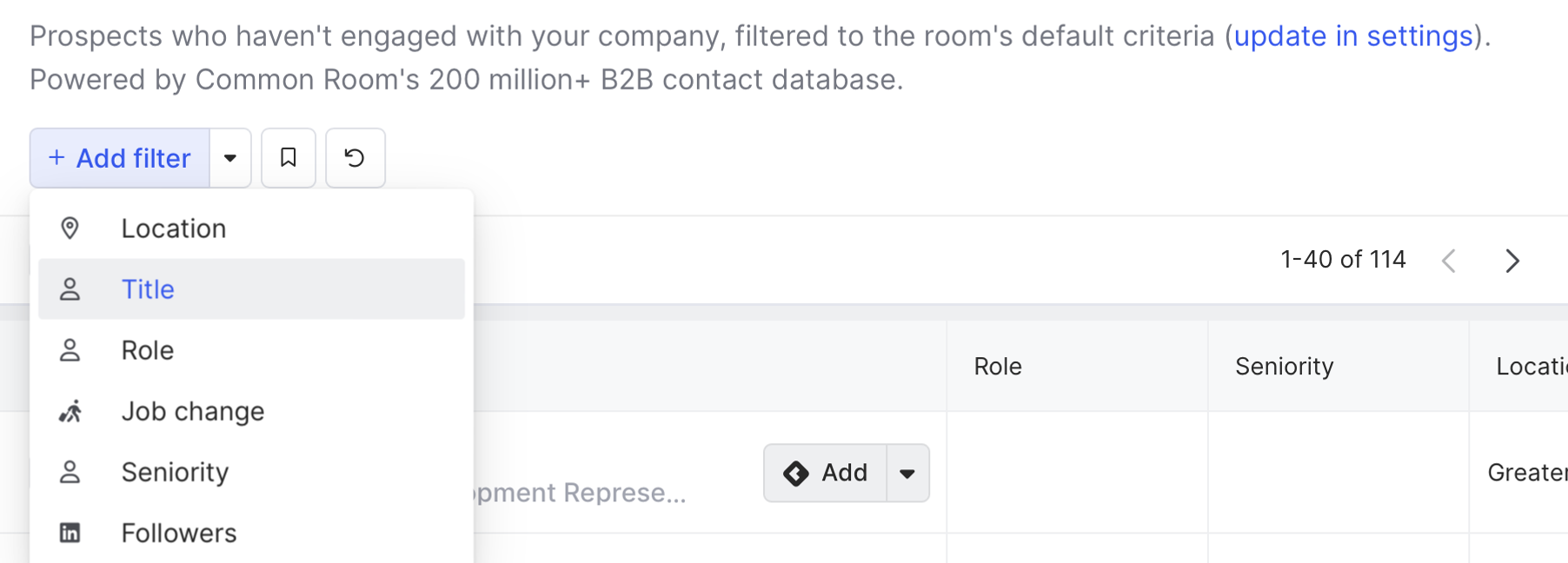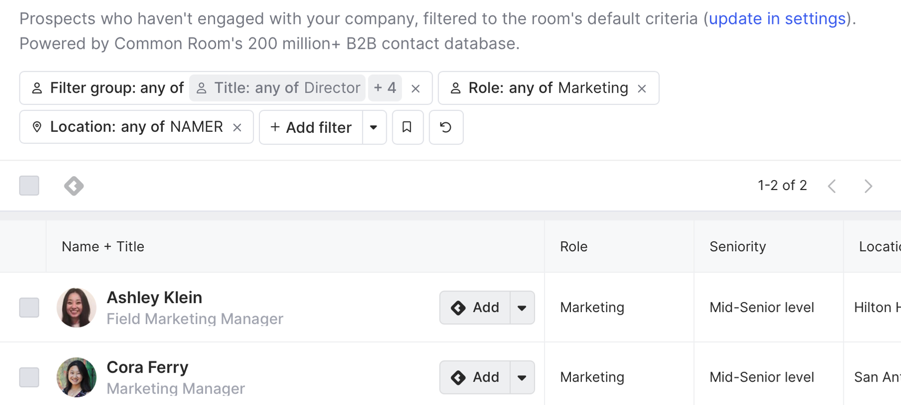 Common Room will automatically search through a proprietary, constantly refreshed database of more than 200 million B2B contacts, identify the ones related to this organization, and surface the ones who match our filtering criteria 🕵️