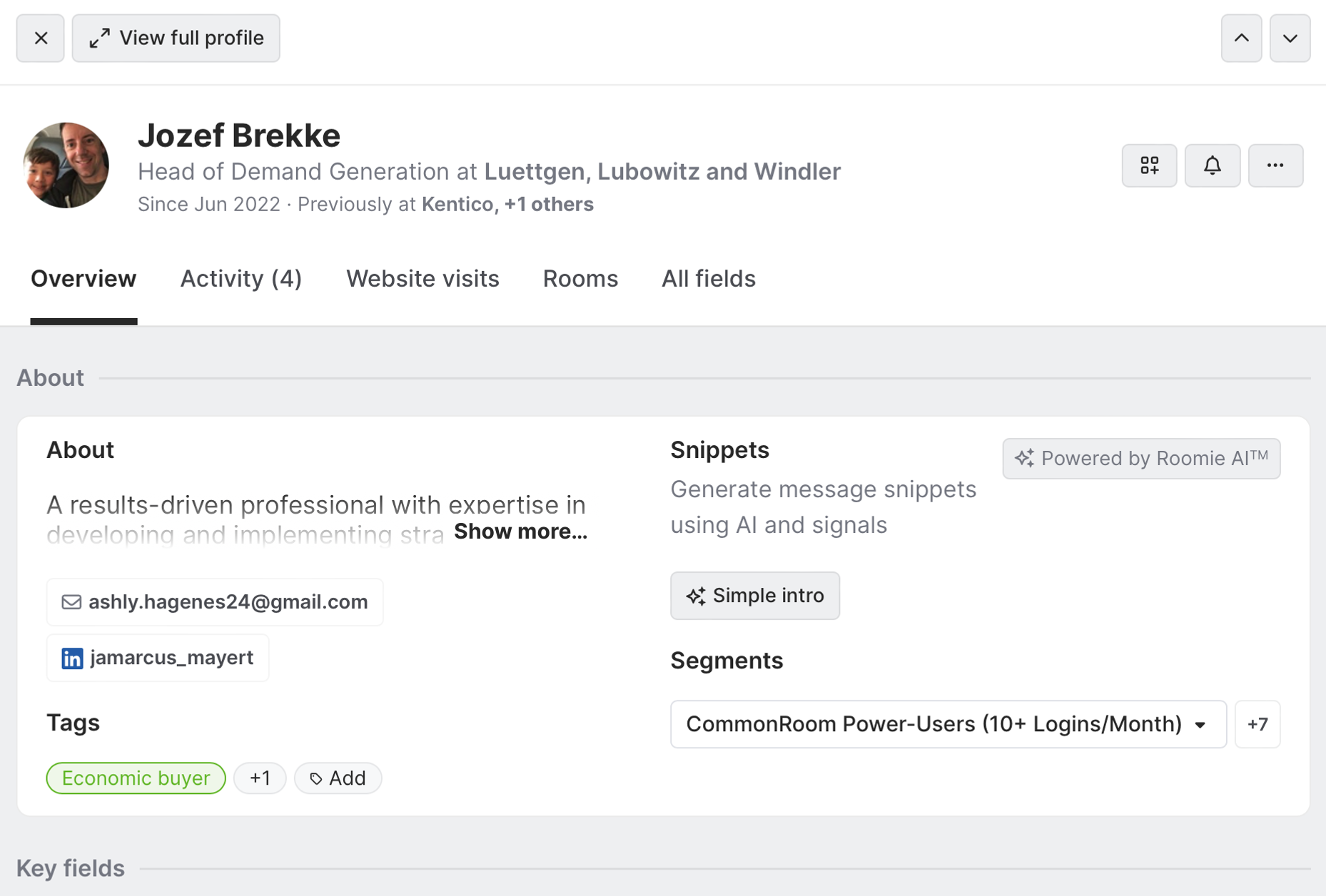 Once the person is added, Common Room’s identity resolution and waterfall enrichment engine—Person360™—will create a profile for them, complete with relevant firmographic details and contact information 🪄
