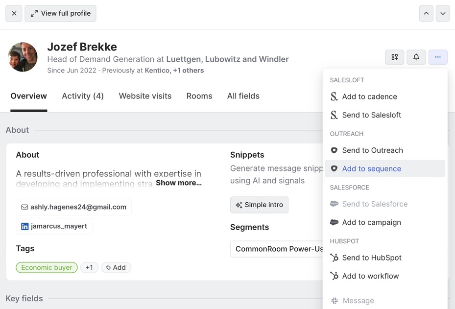 From here can easily sync them with our CRM, add them to segments for different sales plays, or drop them into a personalized outbound sequence—all from the same place.