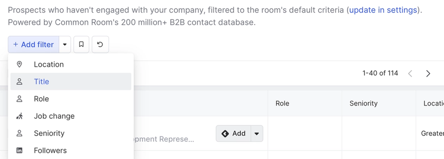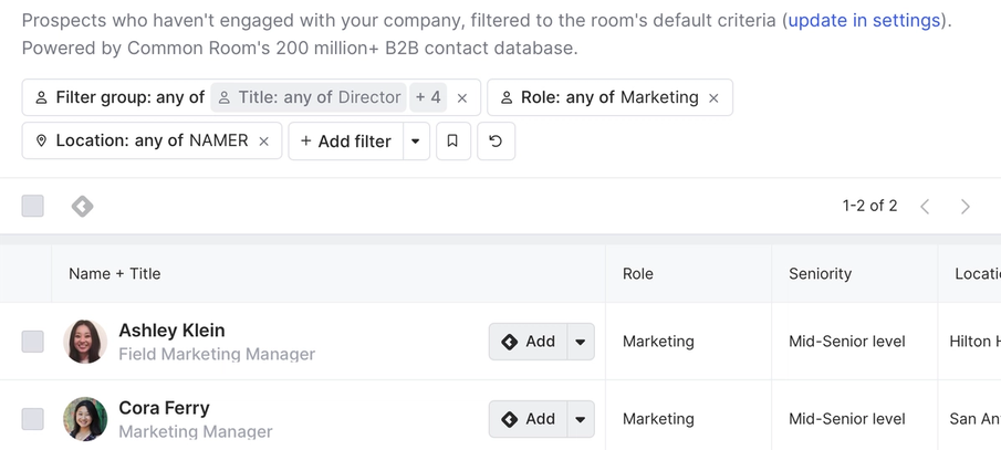 Common Room will automatically search through a proprietary, constantly refreshed database of more than 200 million B2B contacts, identify the ones related to this organization, and surface the ones who match our filtering criteria 🕵️