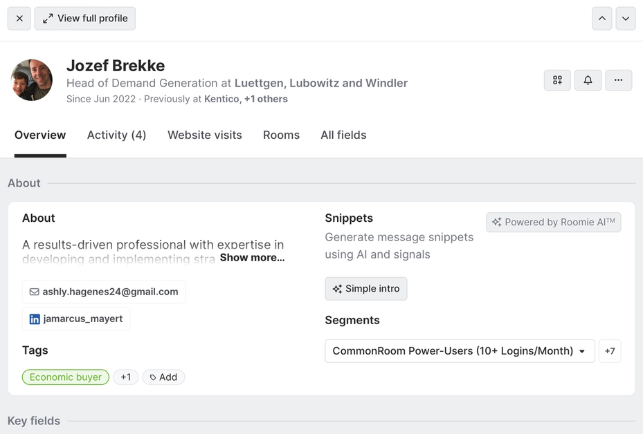 Once the person is added, Common Room’s identity resolution and waterfall enrichment engine—Person360™—will create a profile for them, complete with relevant firmographic details and contact information 🪄