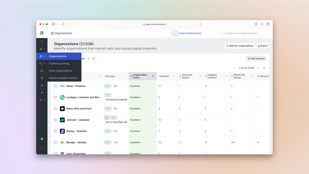If the org is already tracked in Common Room, we can simply click into it. If not, we can hit the Add new organizations button in the top right and add it via website URL.