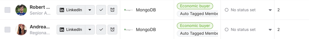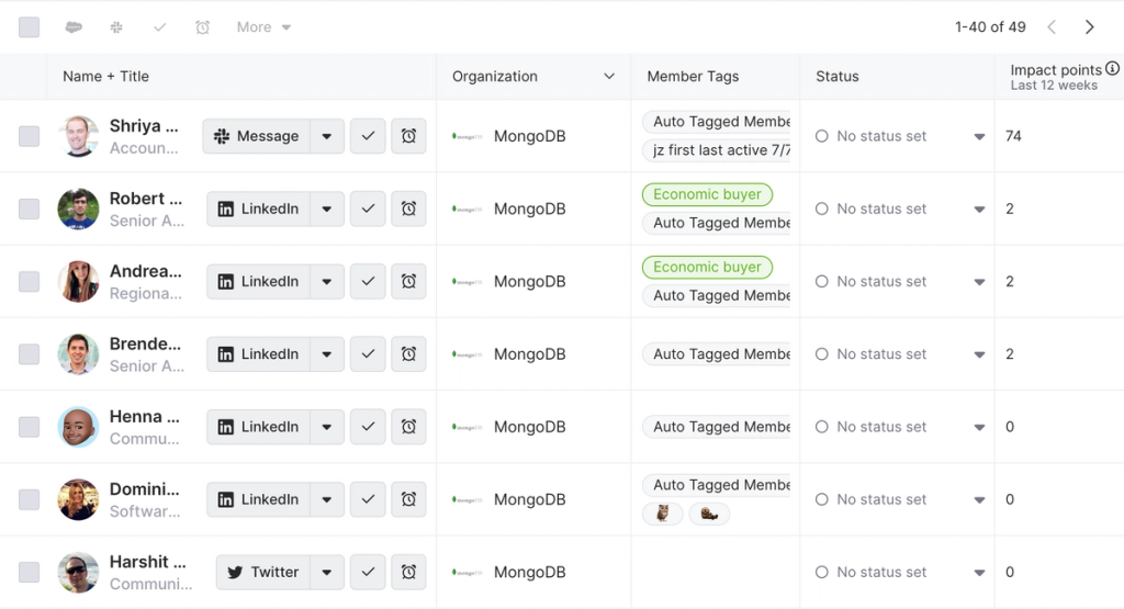 This automatically transforms our list of people into a burn-down list. We can send them emails and Slack DMs, jump to their social profiles, sync their records with Salesforce, and more—all from the same place.