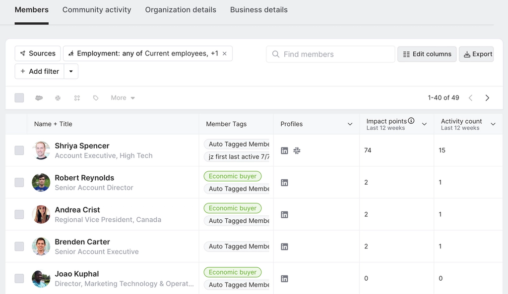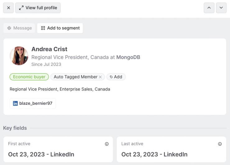 We can filter these individuals based on job title, economic buying power, and more, as well as double-click into them to get a peek at their work histories, contact information, and recent cross-channel activities.