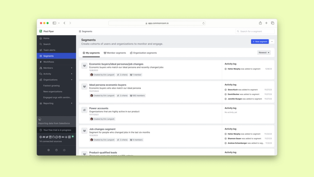 For instance, we could create a segment for organizations that match our ideal customer profile and have employees who recently signed up for a free trial of our product.