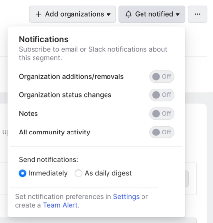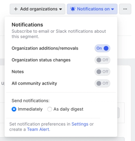 This is where we can determine which segment activities we’re notified about and how quickly. In this case, we’ll toggle on Organization additions/removals and say we want to be notified immediately (keep in mind that you can determine whether these notifications are delivered via email or Slack from the Notifications section of the Settings menu).