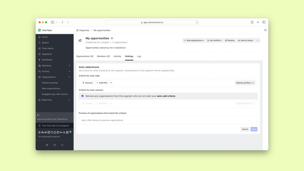 By connecting it to Common Room, we can use Salesforce fields to filter for the opportunities owned by us.