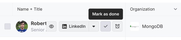We can then mark them as complete or snooze them so we know an action has been taken and continue working our way down our list, either for this company or a different one.