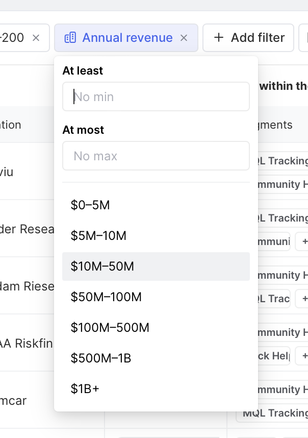 We’ll add a few filters using the preset buttons and set Organization size to > 50 and Annual revenue to > $10M.