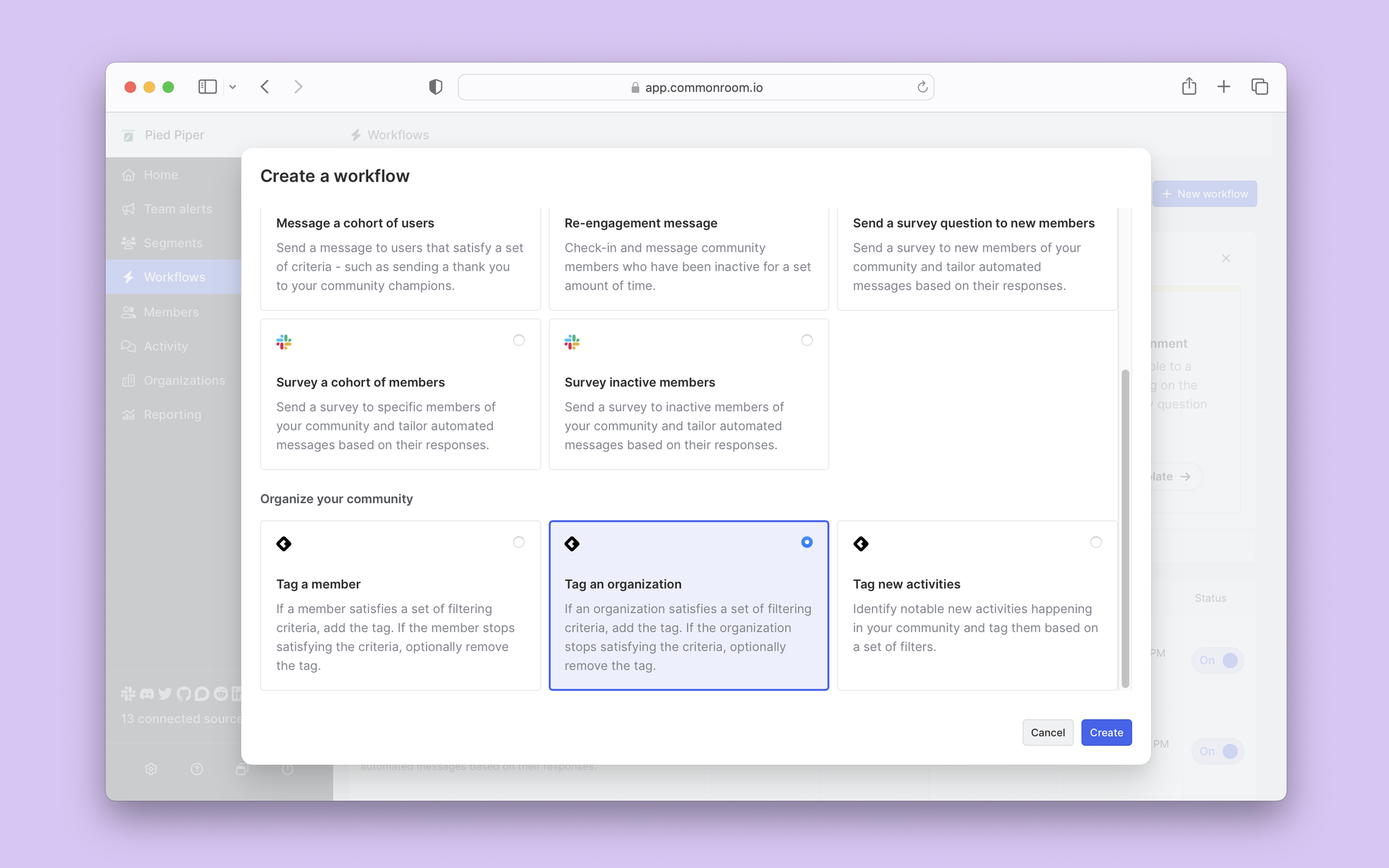 In Common Room, you can create workflows that automatically add tags to organizations, contacts, and activities.