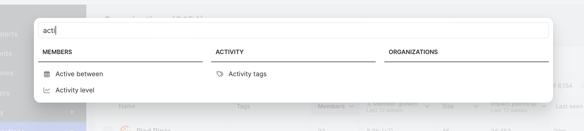 From the Organizations menu item, we can begin adding filters and get a preview of accounts that meet our criteria.