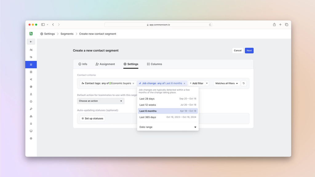 Let’s say we’ve been seeing success with our recent job-change plays. We want to help our SDRs focus on economic buyers who switched roles in the last six months and currently work at organizations that match our ideal customer profile.