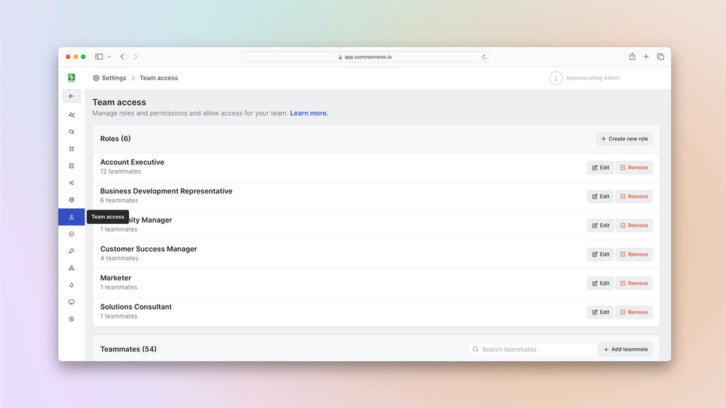 Several default roles—like Account Executives, Business Development Representatives, and Marketers—are available out of the box. We can edit an existing role or create one of our own.