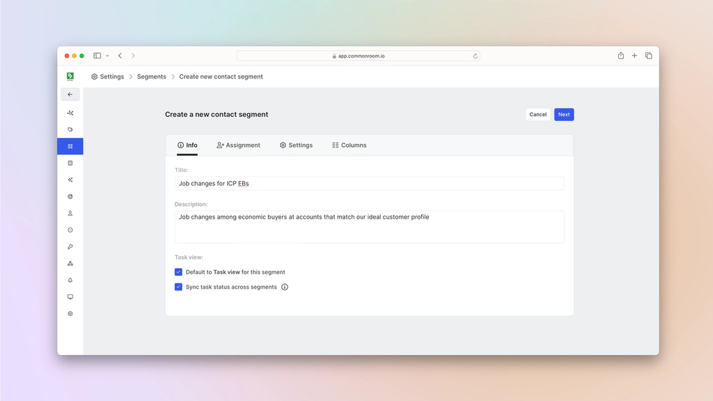 SegmentsCommon Room’s segments feature allows you to automatically add individuals or organizations to auto-replenishing lists based on customizable criteria. This makes it easy to quickly surface, monitor, and engage specific people and companies at scale.