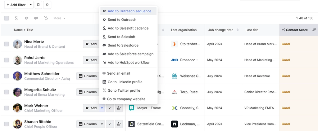 They’d simply click the dropdown arrow next to a contact’s name and select their preferred action, such as sequencing the contact in a sales execution platform.