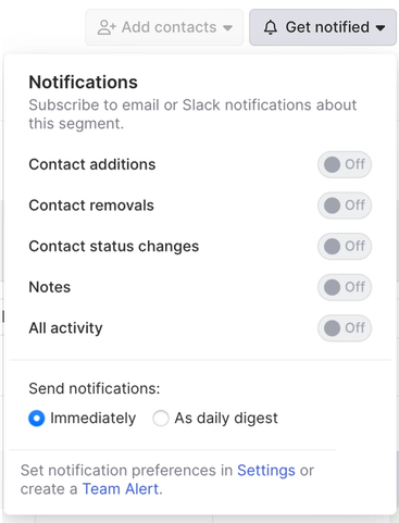 Reps can choose to be alerted to activity within a segment, including new additions, by clicking the Get notified dropdown menu.