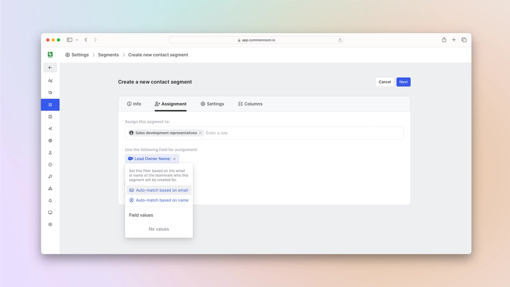 Next we’d click into the Assignment tab to assign this segment to specific roles. In this case, we’d choose our new role: Sales Development Representatives.
