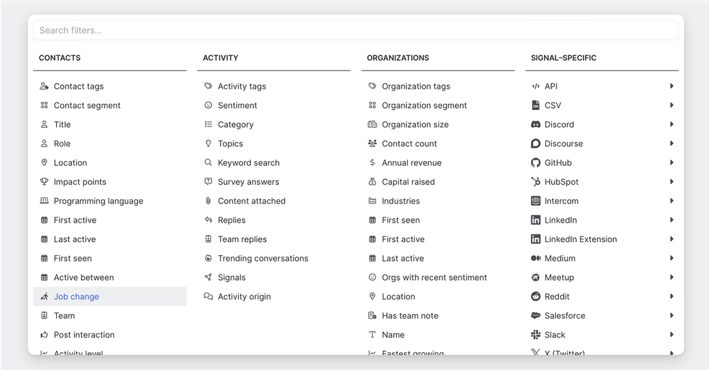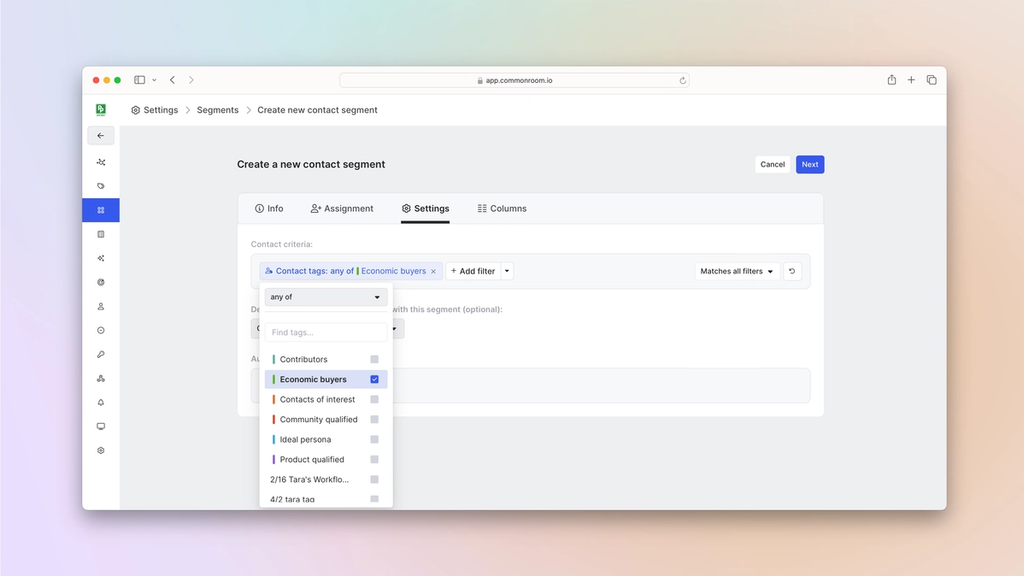 Common Room’s tags feature allows you to automatically label individuals and organizations with specific tags based on customizable criteria. This makes it easy to quickly filter for ideal personas, ideal customer profiles, and more.