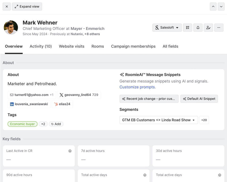 Reps can click into any contact in the segment and view their Person360™ profile, which includes contact information, work history, firmographic details, and any first-, second-, and third-party signals tracked within Common Room, like website visits, product usage, social engagements, and more.
