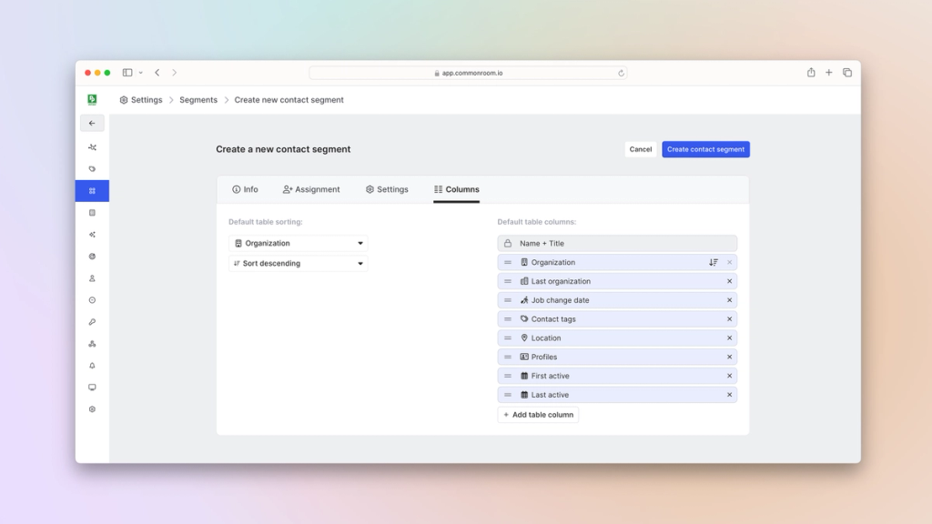 Common Room provides default columns for every segment view, depending on whether it’s for contacts or organizations. These include things like organization name, job change date, and location.