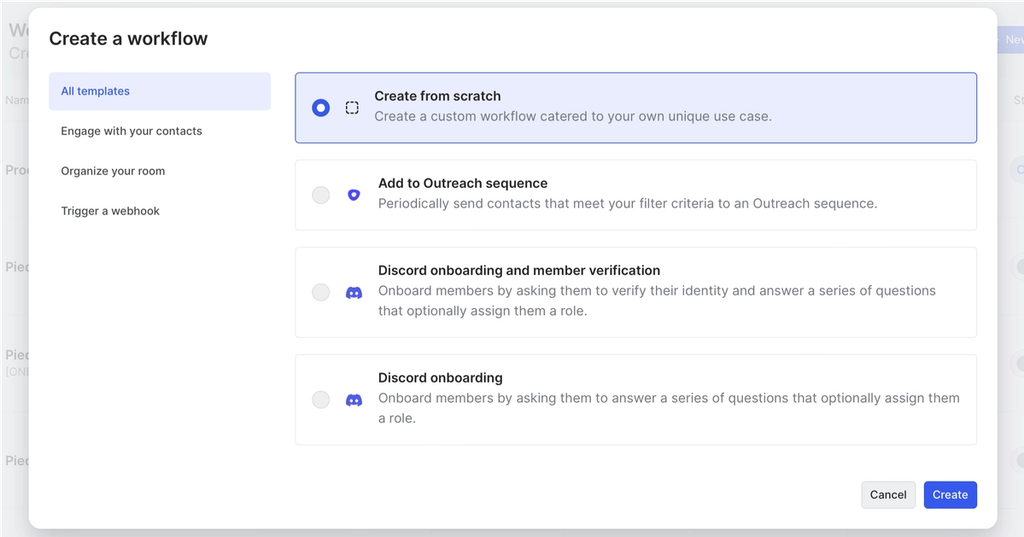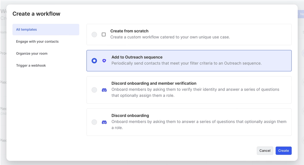 After we save our new automation, we’d go back to Workflows, hit New workflow, and select Add to Outreach sequence.