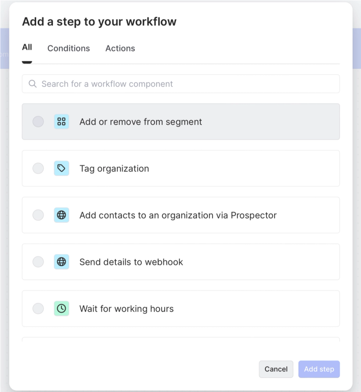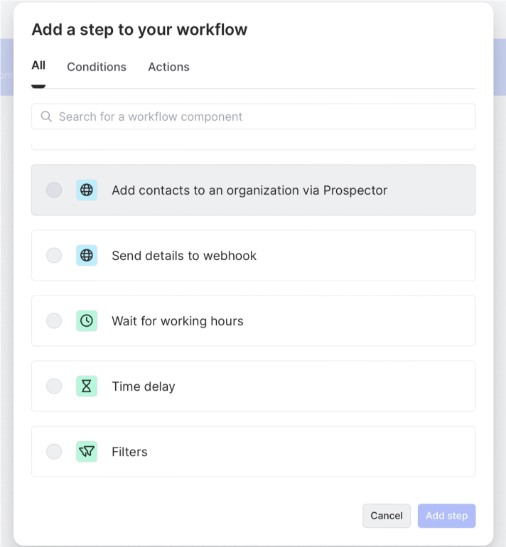 Next we’d click Add step and select Add contacts to an organization via Prospector.
