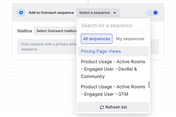 Now that we've streamlined audience creation, we can automate taking action on this audience by automatically sending prospects to a personalized outbound sequence.
