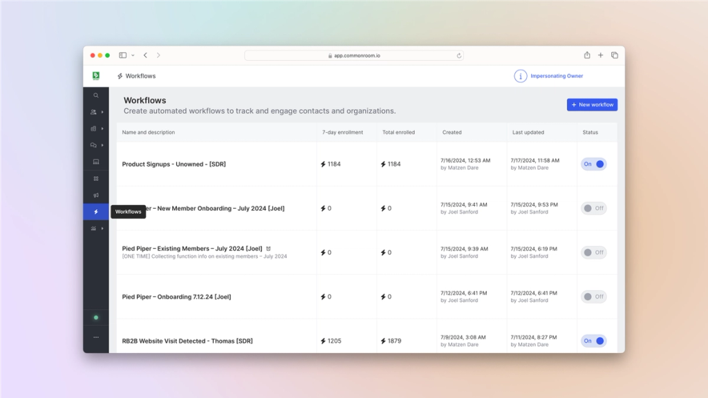 Common Room’s workflows feature allows you to create and customize automations based on specific demographic, firmographic, and activity details. This makes it easy to quickly track, organize, and engage people and accounts at scale.