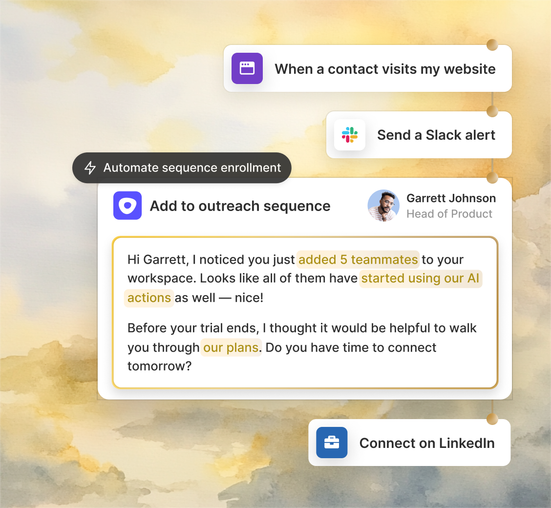 Generate pipeline while you’re away with powerful workflows that automate every step of the pipe gen motion. Automate everything from account research to prospecting, personalization, sequence enrollment, and more.