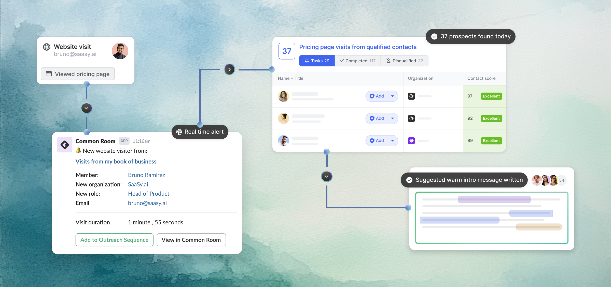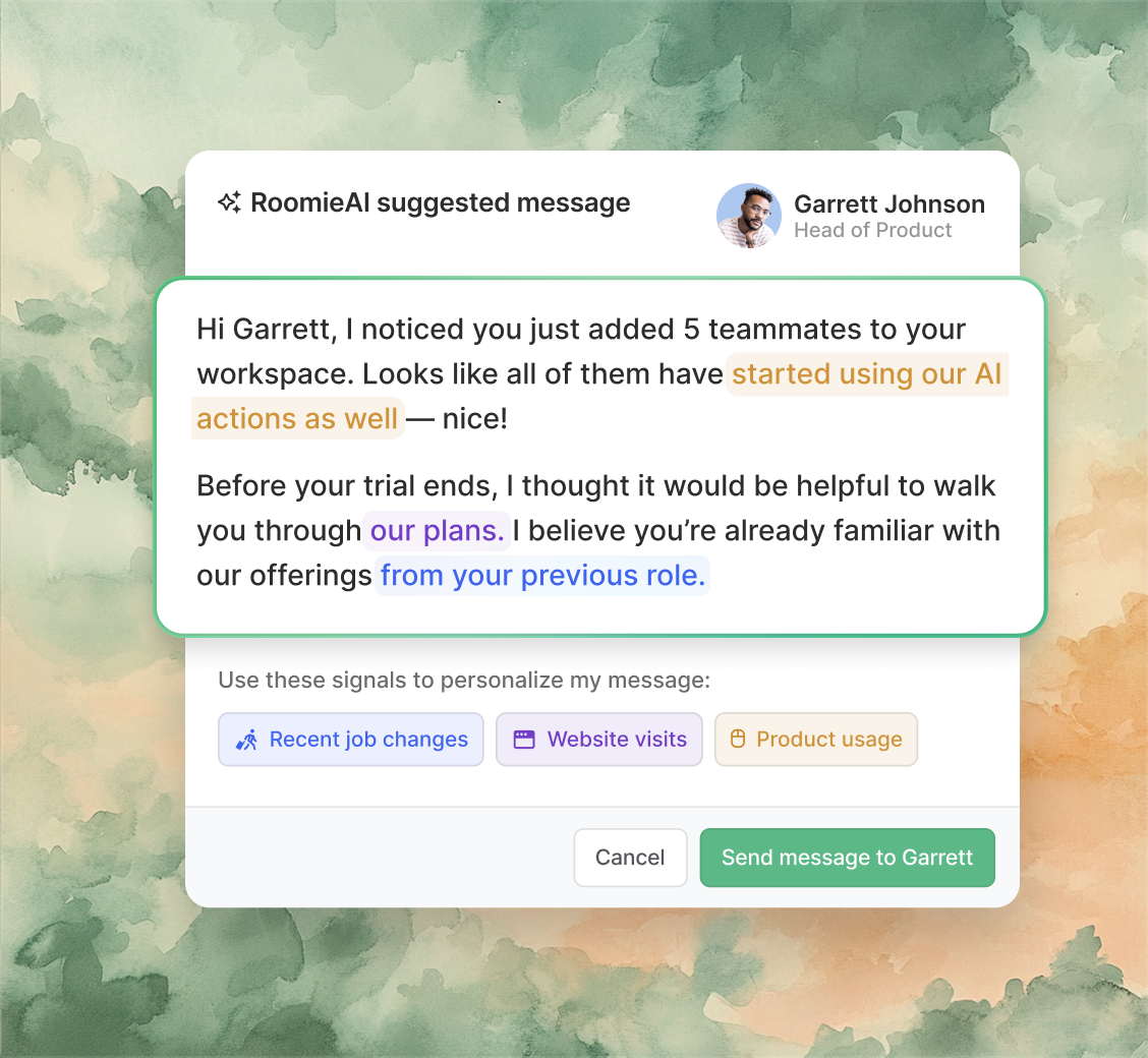 Let RoomieAI™ do the heavy lifting of warm outbound prioritization and messaging. RoomieAI™ Activate agent uses the context of buying signals and enriched data from any prospect or account to generate warm intros that actually convert.