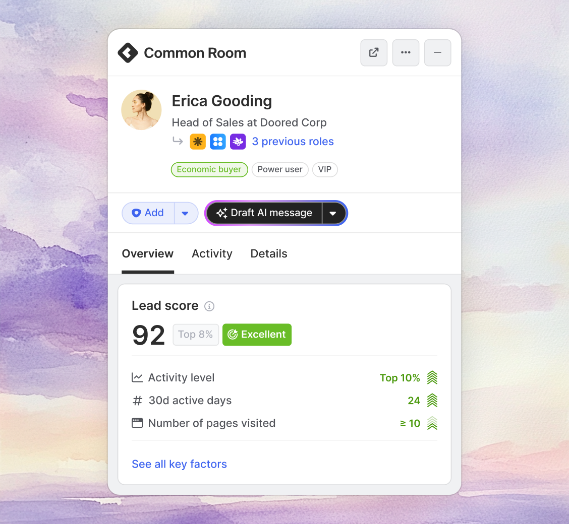 Hover over any score to reveal the exact behaviors and attributes behind the score. Give reps the transparency and context they need to reach out with a message that packs a punch.
