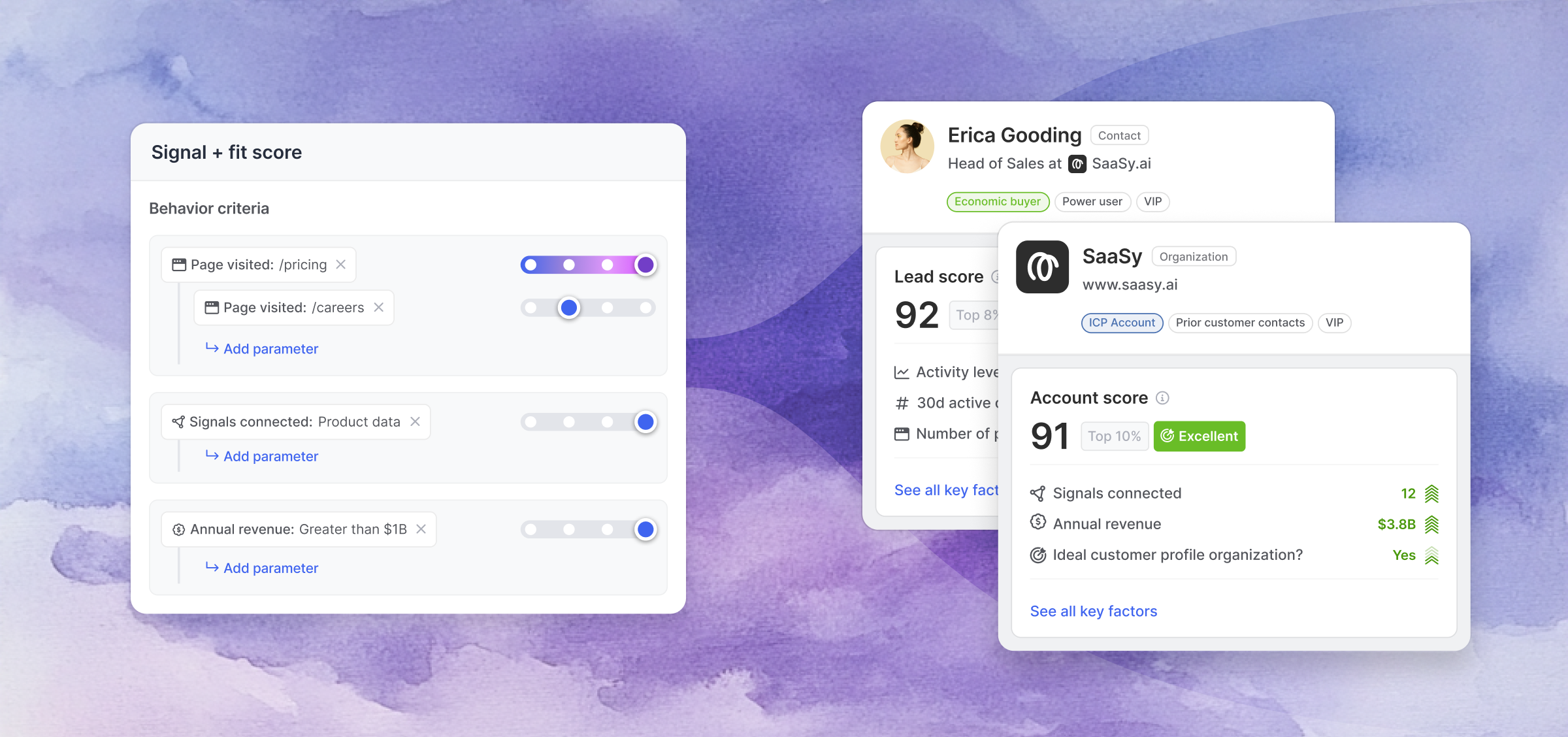 Combine hundreds of buying signals—from first-party product usage to dark-funnel chatter to website engagement—into a single, comprehensive buying intent score. Score signals at the person level and aggregate scores across an account record.